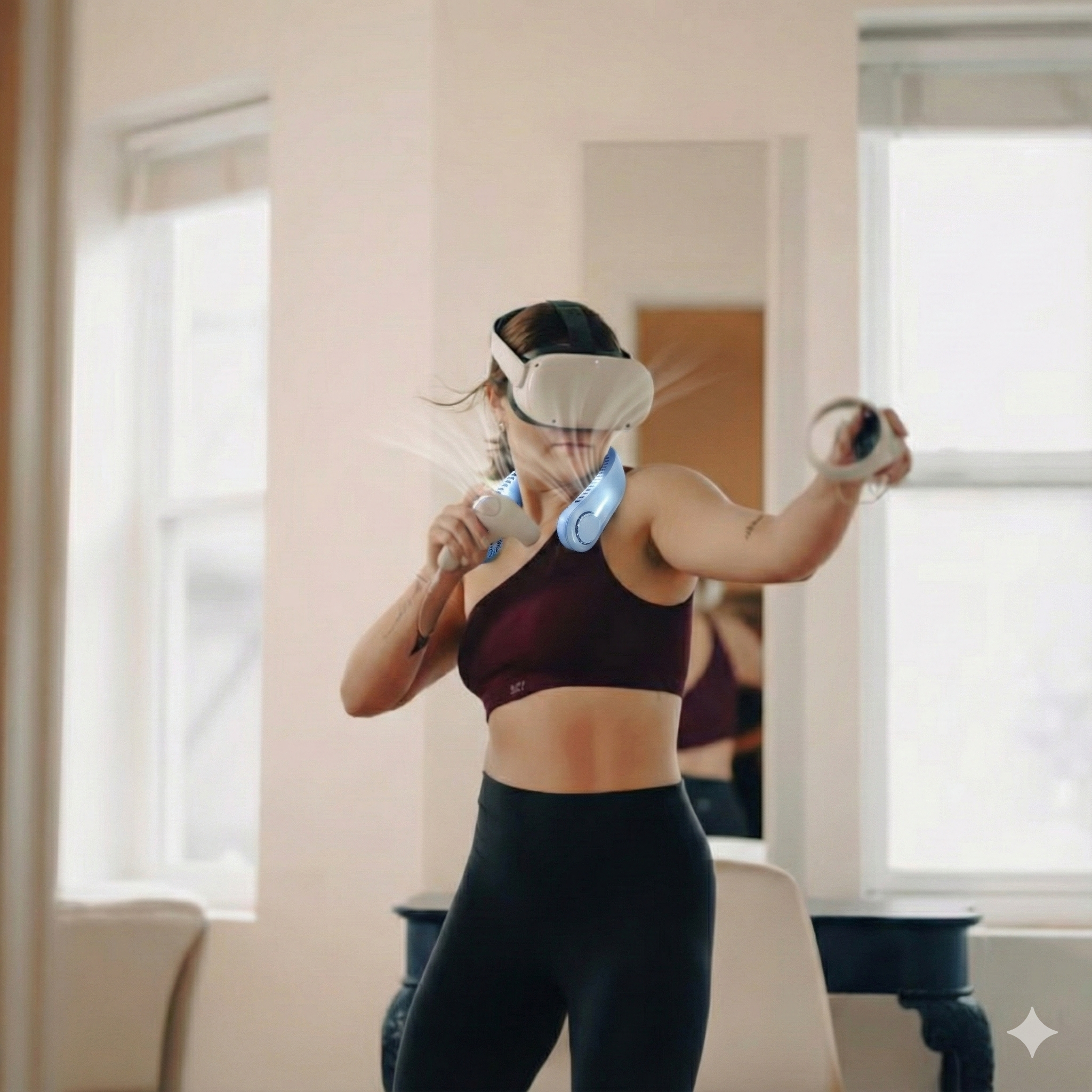 Directed cooling that clears the headset gap. Standard fans push air horizontally. Submerge VR fires upward into the space between your neck and HMD—exactly where heat gets trapped. This eliminates fog and clears the face oven effect in seconds.